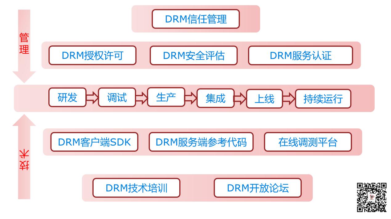 在技术层面,ChinaDRM为产业提供统一的商用DRM客户端和DRM服务端的参考代码,以及在线调测平台,为产业研发、生产、集成部署提供技术支持;在管理层面,其核心是通过DRM的授权许可、安全评估、服务认证来建立完整的信任体系。