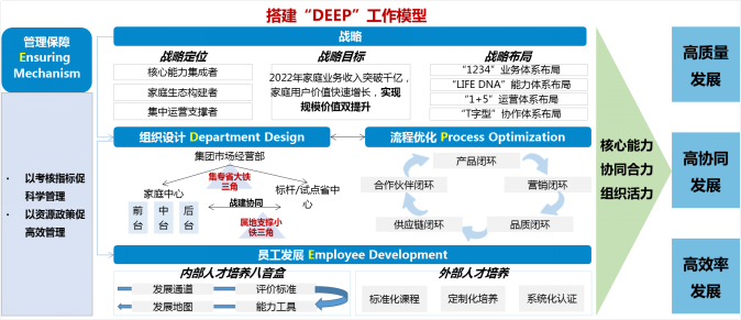 基于“战略-组织-流程-人员”自上而下管理模式,以时代背景、行业形势、企业自身发展要求为驱动,以电子化支撑为抓手,基于智慧家庭市场发展,充分结合“融合融通融智、合力活力能力”的高效协同组织运营理念,逐步建立了组织设计(Department Design)、流程优化(Process Optimization)、员工发展(Employee Development)和管理保障(Ensuring Mechanism)的“DEEP”工作模式,保证家庭市场组织运营体系的切实实施和落地,最终达到智慧家庭业务的规模化、高质量发展。