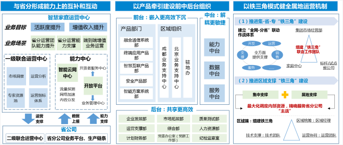 一是构建集中指挥、横向协同、纵向一体的“T字型”运营体系,发挥省专的“战建协同”机制效应。一方面以市场洞察、运营分析、运营指标体系、专家资源池等为核心牵头建设一级联合运营中心,同时为省分公司提供产品支撑,与省分公司共同建设二级联合运营中心,做好运营优化实施、日常运营支撑、局点画像等工作。另一方面,整合内外部优质资源及能力,构建“智能云网+智能平台”能力中心,整合流量探测、网络加速、内容分发等能力,实现运行可视、灵活可调、安全可控及云网无缝融合;家庭开放平台以数据汇聚为载体,对内成为业务集中管理中心和数据运营中心,对外成为开放者服务中心和合作创新中心。二是按照研运一体发展要求,以产品牵引建设前中后台组织。前台面向客户,强调敏捷交互及稳定交付,由智能组网、大屏业务、家庭安防/智能通话、解决方案、智能加速、生态建设为主线的6大业务部门及区域组织组成;中台面向业务及能力,强调标准化能力固化、赋能前台,以智慧中台、品质管理、客户服务为主线,做好中台能力沉淀;后台面向内部运营,强调共享化支撑。三是加强运营支撑职责发挥,以铁三角模式健全属地运营机制。一方面,围绕开发、运营、支撑、销售、服务等全方面提供支撑,推动核心平台、入口及关键能力的适度集中,推进集省专“铁三角”建设,统筹抓好运营落地。另一方面,区域前端组建“区域统筹、运营协同、技术支撑”铁三角,区域经理从“偏销售”向“销售+管理+支撑”角色转变,负责驻地总体统筹,协调资源推进业务落地;运营团队负责产品内容运营、营销推广、生态建设等;技术团队负责省侧技术支撑工作。