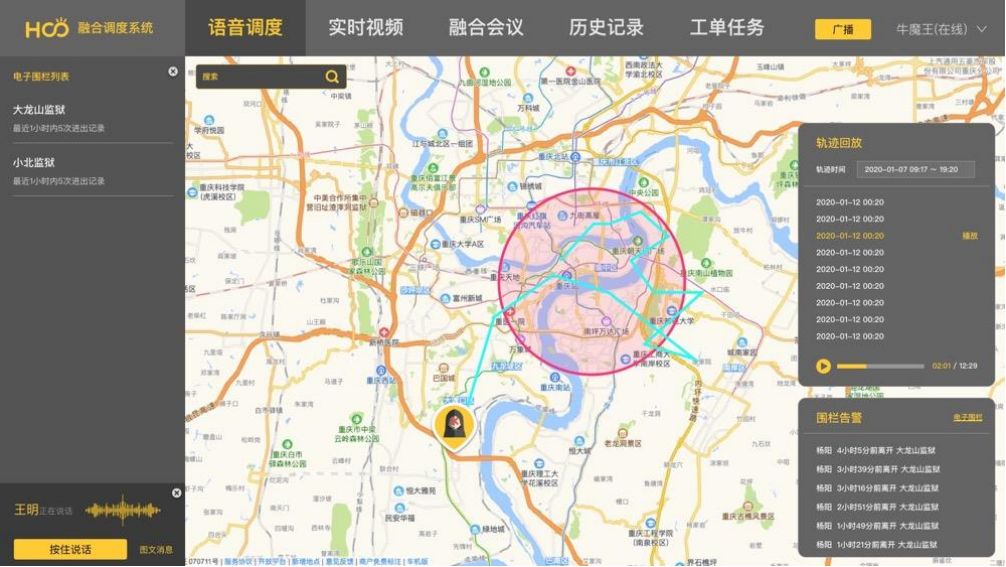 海量报警点周边资源展示(设备、图像、视频、设施)、支持实时位置查询、历史轨迹回放、电子围栏、导航、监控等。