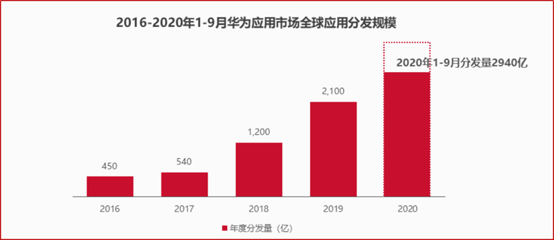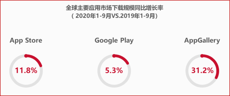 根据《2020移动应用趋势洞察白皮书》的统计数据,2020年1-9月全球主要应用市场下载规模相较于去年同期均有所增加,其中App Store下载量同比增长11.8%、Google Play同比增长5.3%、AppGallery(华为应用市场)同比增长31.2%。2020年1-9月华为应用市场全球累计应用分发量为2940亿,超出去年全年分发规模,华为应用市场表现出的分发能力为开发者获量增长提供了又一个选择。