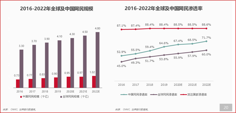 目前已知的一个利好条件是2021年全球网民数据又将达到新高。根据CNNIC以及世界银行数据,预计2021年全球网民规模将达到45亿,中国网民规模将达到9.7亿。另外全球网民渗透率将达到57.9%,中国网民渗透率将达到68.5%,新网民的增加无疑是为逐渐进入存量时代的互联网市场带来一股新鲜的血液。