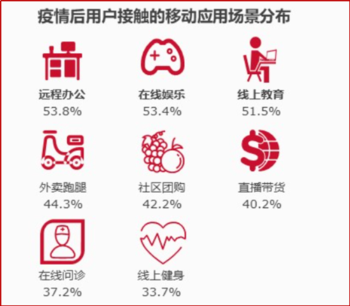 根据艾瑞咨询调查数据,相比之前,50%以上的用户会更多使用远程办公、在线娱乐以及线上教育服务。