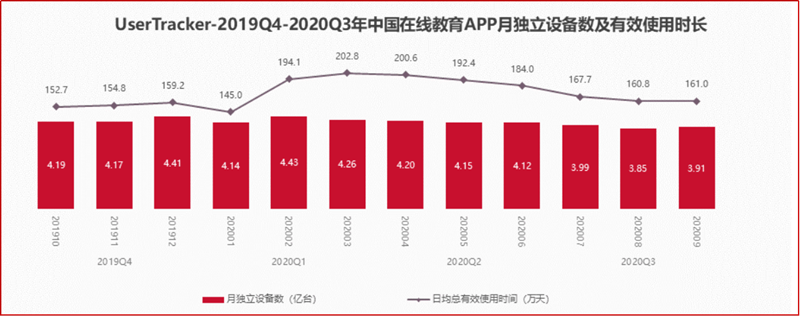 根据UserTracker数据,可以看出尽管随着国内疫情形势好转,使用线上教育App的设备数量有所减少,但用户使用总时长仍明显高于疫情前水平。
