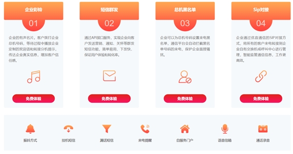 优音云总机不仅具备传统企业总机与直拨电话的通话功能,还提供企业彩铃、挂机/漏话短信、通话录音、电话会议、黑名单、自服务门户管理等更多增值服务,让更行业商企客户根据自身需求,能灵活多样地设置最适合自己行业的通信方式和语音服务能力。