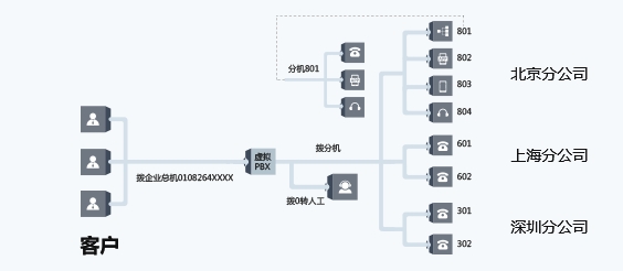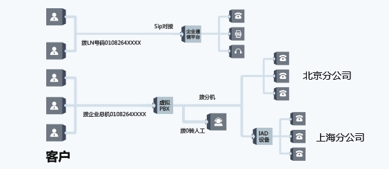 小型客户一般只有一两个坐席,可采用直线电话模式。用户拨打企业电话号码后,来电直接转给预先设定的终端,快速接听。