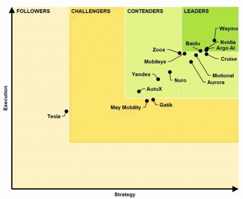 据报告,Guidehouse从企业愿景、市场策略、合作伙伴、生产策略、技术、销售&营销&分销、商业化程度、研发进度、产品组合、资金实力十大维度出发,对全球15家自动驾驶企业进行综合评测。同时,根据执行能力(Execution)和策略能力(Strategy),Guidehouse将这些玩家划分为“领导者”、“竞争者”、“挑战者”、“跟随者”四个等级。