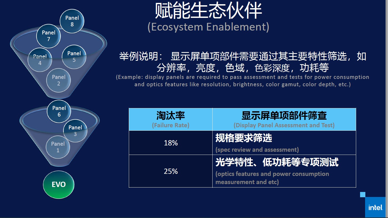 用开放性实验室工程师的话来说,这样的笔记本研发状态就相当于用两条腿走路,一方面,开放性实验室能够实现生态链系统部件级的研发和检测,另一方面,在检测完成之后,OEM、ODM整机开发伙伴则可以直接将其吸纳到自己的产品中,并进行下一轮整机认证测试,只有上述所有流程合规,产品才能获得英特尔Evo平台认证。