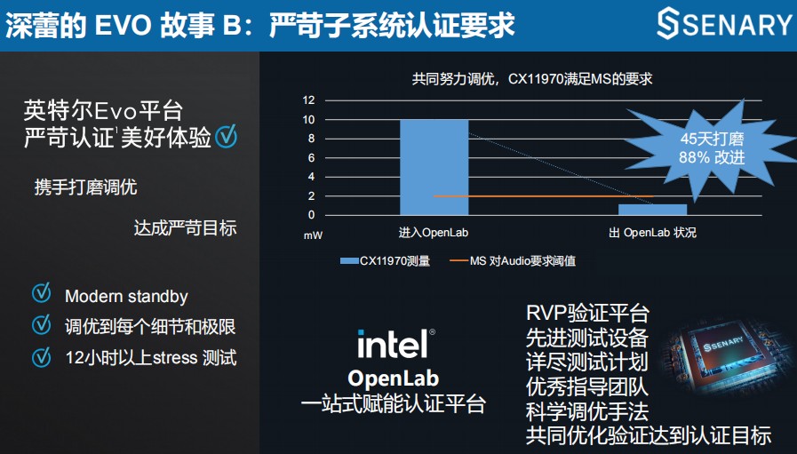 回到文章开头的故事,深蕾工程师最终在45天后将音频解码芯片声音阈值降低至2mW以下,最终实现了88%的改进。是的,一个半月前来自英特尔Evo平台的苛刻要求,最终变成了现实。