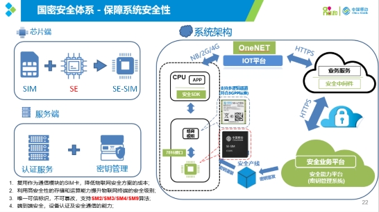 在安全保障方面,方案由中移物联网自研的国密级安全芯片SE-SIM,及和云盾——安全加密服务平台两部分组成,具备国密二级、EAL4+资质。以SE-SIM为硬件可信根,以和云盾平台为认证端,方案支持多种国际/国内加密算法,可完成设备终端到业务平台端到端的全方位安全支撑。