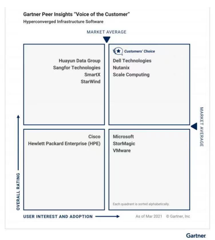 近日,Gartner发布了超融合基础软件“客户之声”报告(Gartner Peer Insights“Voice of the Customer”: Hyperconverged Infrastructure Software),就深信服、Cisco、Dell Technologies、HPE、华云数据、Microsoft、Nutanix、Scale Computing等12家全球主流超融合服务商的客户评价进行了综合分析。深信服超融合(Sangfor HCI)在用户推荐意愿、公司规模和市场覆盖率方面均表现优异,成功入选该报告。