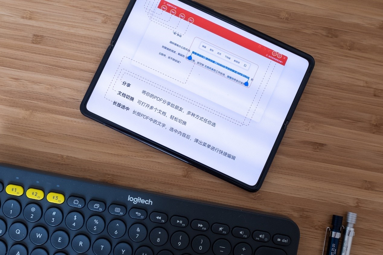 可能很多人希望有个折叠屏手机的想法和我一样就是要为自己的出行减轻负担。手机的大小,比iPad mini还要大的屏幕,配合上小米MIX FOLD的PC模式。虽然说不可能100%替代电脑,但是在任何场合下应急办个公都是绝对ok的。双手拿着就能轻松打字,还免去非要为笔记本找套桌椅的麻烦。其实从适用场景上看折叠屏比笔记本可能还更方便一点。说回小米MIX FOLD的掌上PC模式,这个功能已经跟随系统更新正式解锁成功。三指横滑轻松进入如Windows一样的桌面。开始菜单,桌面图标,任务栏、系统托盘一应俱全,操作的学习成本几乎为0,而手机上大家常用的WPS办公软件相信不用多说大家基本都用过。而且的确像小米官方说的那样,在PC模式下可以实现多任务窗口,跨窗口操作、文件、图片、APP图标也可以按照自己喜欢的方式任意摆放。亲切感油然而生,终于可以像Windows一样手忙脚乱的翻腾文档了。