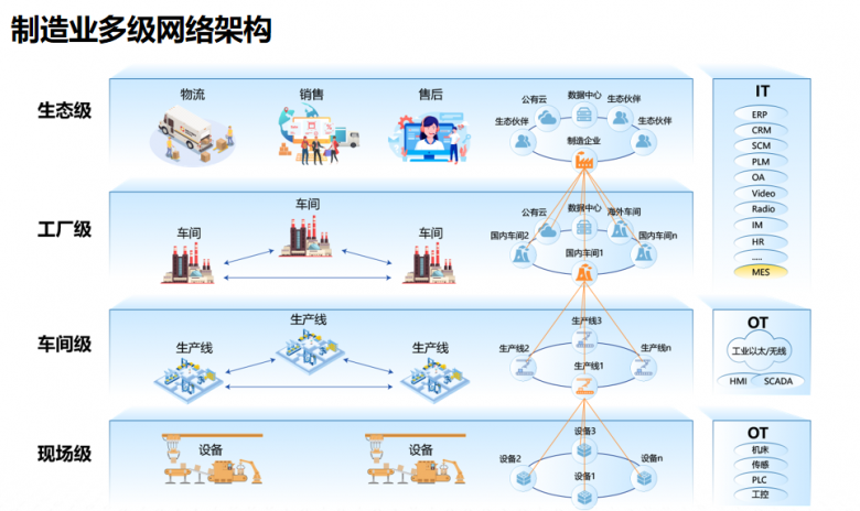 制造业是一个现场-车间-工厂-生态的多级网络架构。现场级与车间级属于企业内网,即生产网(OT),工厂级与生态级属于企业外网,即IT网。纵观工业互联网的发展形势,随着IT与OT的逐渐融合,制造企业面对业务多元化应用场景,将需要打破信息孤岛,从现场级到生态级进行全面数据互通。