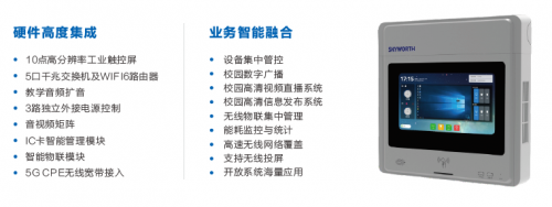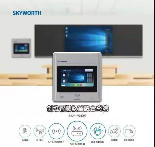 创维智慧教室融合终端是秉承“以人为本”理念,充分为用户着想,依据教育一线的教学需求和应用场景,专为现代教室设计的一款智慧终端产品。它集成10点电容触控屏、WIFI6路由器、5G CPE无线宽带接入、智能安卓平台、数字功放、音视频矩阵、IC卡智能管理模块、智能物联模块等高度集成硬件,真正实现设备管理与校园业务的高度融合,实现一通全通、三网融合。产品人机界面友好,操作简便、安装维护方便,是一款实用性好、可靠性高、功能齐全、扩展性强的设备精品。