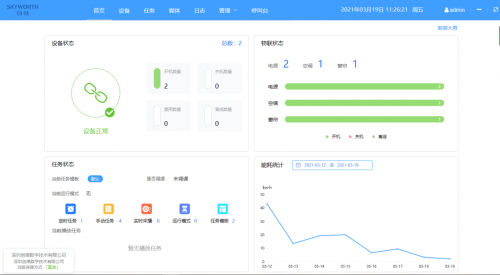 创维融合系统支撑平台可对接入的大屏、空调、前排灯、后排灯、窗帘等设备进行使用能耗及使用时间监测统计。