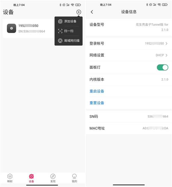 花生壳管理APP支持通过SN码、扫描设备二维码及局域网扫描三种方式添加绑定设备,点击在线设备,APP3.2将弹出“设备信息”界面,可对登录帐号进行切换、退出操作,重启或重置设备,查看设备型号、SN码、MAC地址等详细信息,功能更加集中完善。