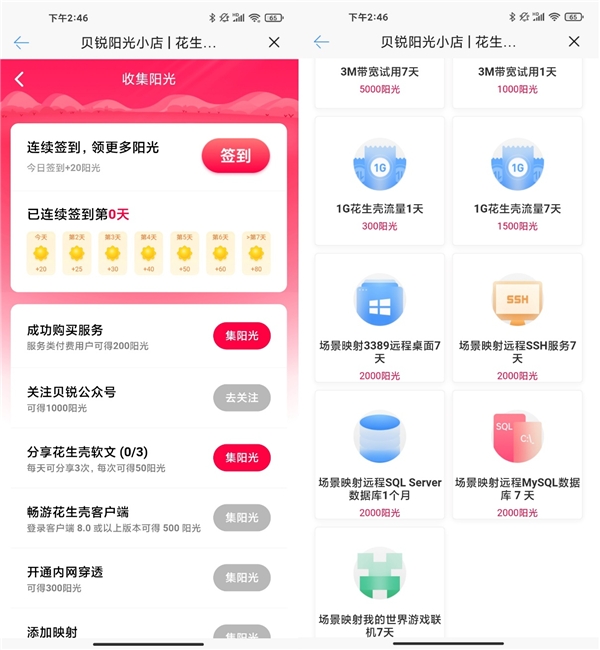 此次升级,安卓版花生壳管理APP3.2还给用户带来了更多福利优惠。阳光小店新增多种“集阳光”方式,用户只需动动手指就能轻松获取阳光值,并用阳光值兑换带宽、流量、场景映射等服务,让免费用户通过轻松互动的方式获取更多花生壳服务。