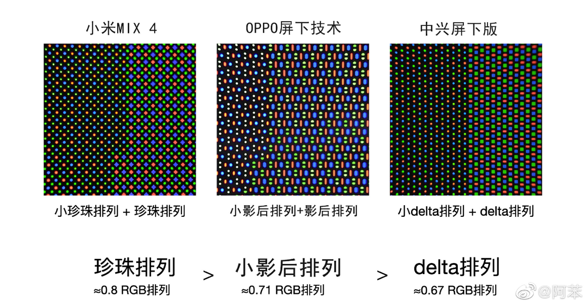 三家厂商的屏下摄像技术可以说是并驾齐驱。虽然三家都强调优于对方的屏幕效果,但在像素排列上却是一场暗戳戳的较量。中兴和OPPO采用的是传统OLED屏幕像素排列方式。分别为小Delta排列和小黄鸭排列。小米MIX 4采用的是「小珍珠」排列方式。