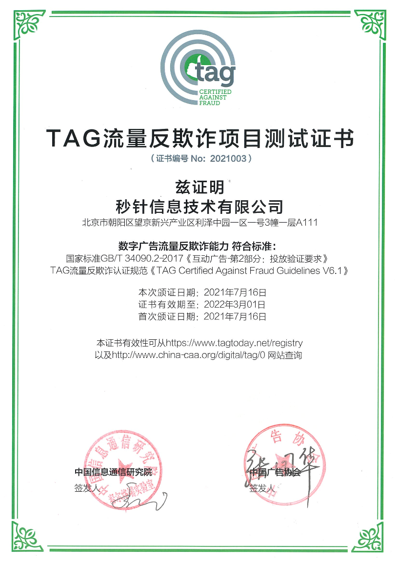 秒针系统《TAG流量反欺诈项目测试证书》
