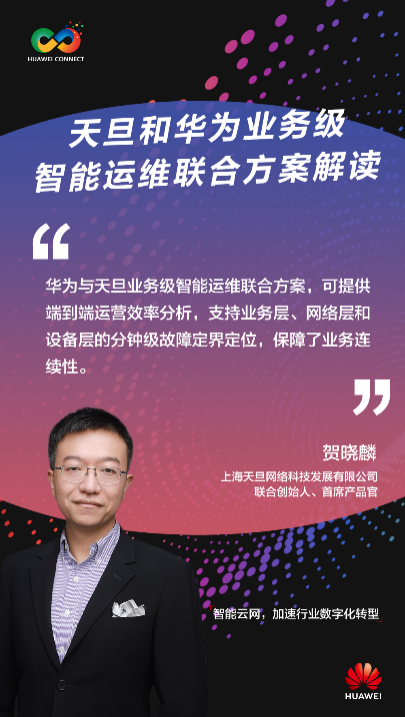 天旦联合创始人&首席产品官贺晓麟先生表示:“天旦作为国内领先的智能运维产品提供商,致力于为用户提供以业务为视角的智能化运维管理保障。我们认为此次联合华为发布的‘业务级智能运维解决方案’真正做到了科技与业务的结合、业务与应用性能管理的融合。同时,针对目前客户中普遍存在的混合云环境,也提供了云上云下的一体化管理,充分保障用户的业务稳定性与连续性。”