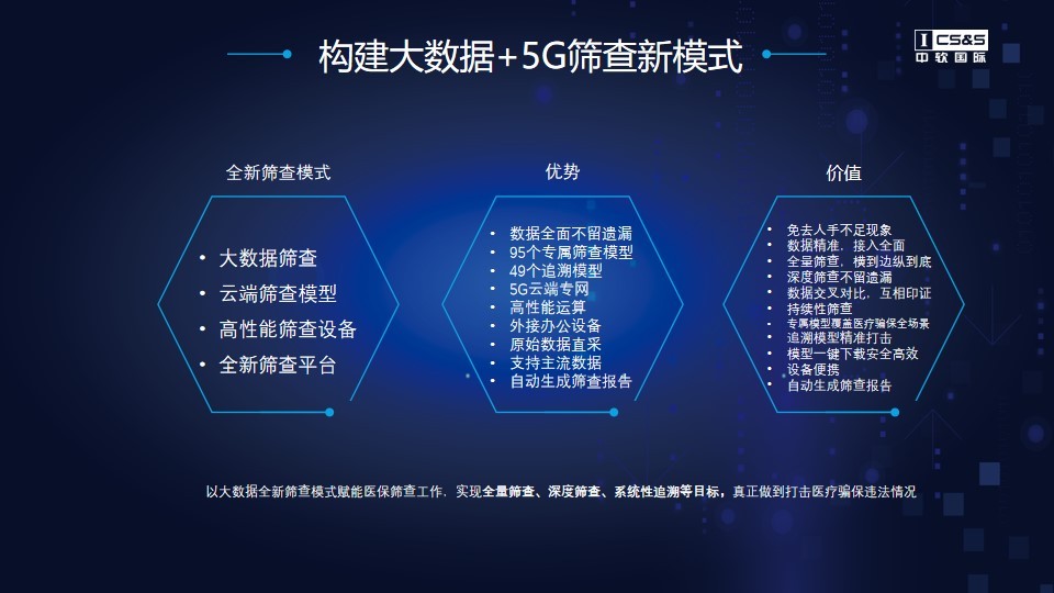 在解决方案层面,中软国际打破原有技术壁垒,推出医保基金大数据检查模式,有效提高检查能力、质量和效率。通过全量审计、全局审计、交叉对比、互相印证、持续审计的大数据检查模式帮助医保局快速、精准、高效的定位问题,并持续监测问题产生,真正做到“横到边、纵到底”的检查目标,扩大打击骗保的广度和深度。