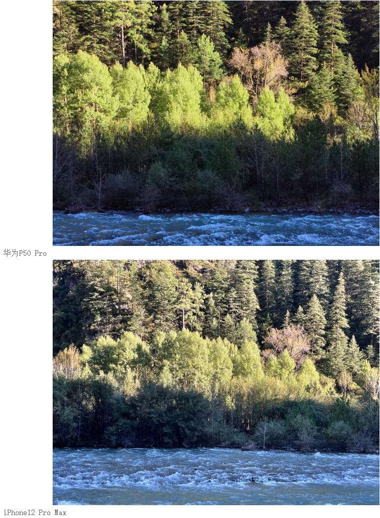 这是一组貌似简单实则困难的测试,氤氲雾气、空气中阳光散射形成的淡蓝色“烟雾”是对比的重点,用力过猛的计算摄影算法,可能会通过显著提高对比度来让画面更清晰,细节更突出,或者会减弱明暗对比追求HDR效果而让画面整体发灰发白。实拍对比过程中,两部手机都表现得比较恰当,iPhone12 Pro Max的对比、去雾力度更大一些,且画面色温色调比华为P50 Pro更暖一些。对比不失真、降噪不涂抹、锐化不沙化,这是计算摄影的趋向之六。