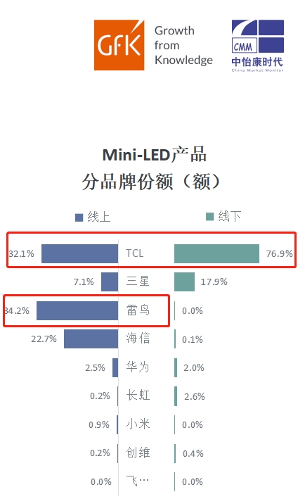 根据捷孚凯和中怡康共同出具的一份《2021彩电市场调研报告》来看,MiniLED智屏产品市场规模明显大幅增高,这意味着该条赛道已经进入了高速发展阶段。令人意想不到的是,根据目前-MiniLED智屏产品的品牌份额来看,TCL的QD-MiniLED智屏份额远超三星、海信、华为等友商,以势不可挡的姿态成为了这个领域的“头号玩家”。