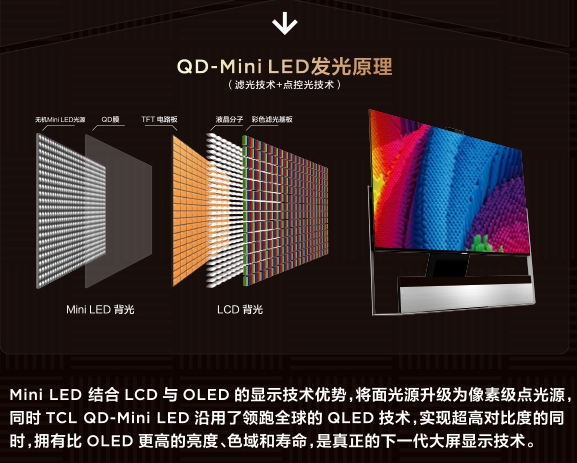 与行业大多数Mini LED背光源液晶显示系统不同,TCL的QD-MiniLED在发光层和偏转层之间,加上一层QD量子点层,经过纳米级量子点材料,实现10亿级的色彩,色域更广,色彩更纯,更久。因此,TCL的QD-MiniLED技术兼具LCD和OLED的优势,突破性的解决了微粒LED芯片巨量转移的行业技术难题,是显示行业的一次革命性升级。