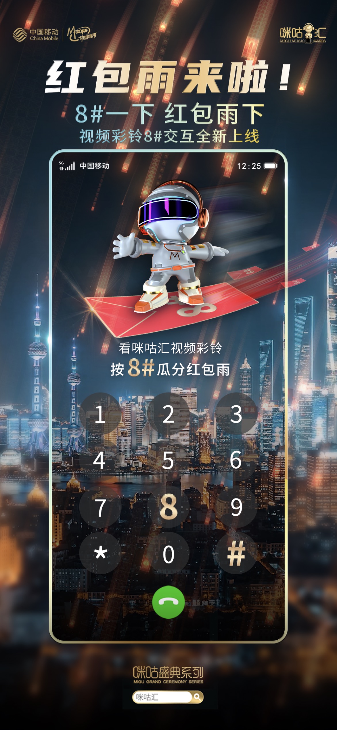 随着盛典阵容官宣,丰富的主题活动也陆续上线。12月7日-31日期间,中国移动视频彩铃联合咪咕汇首创推出了“看咪咕汇视频彩铃按8#瓜分红包雨”的活动,用户在拨打电话时看到“马上按8#瓜分红包雨”的咪咕汇指定视频彩铃,按下8#键即可参与抢红包活动。