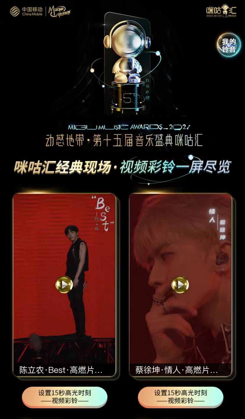 从2018年由中国移动全球首创至今,中国移动视频彩铃用户规模已经超过2.3亿。除了中国移动咪咕旗下4000万+音乐版权、头部体育IP及影视IP、UGC内容,视频彩铃更作为抖音、腾讯、B站、百度等1000+内容合作伙伴内容分发平台,成为众多顶级热门电视剧、电影、综艺等IP宣发的首选平台之一。例如2020东京奥运会、国庆档大电影《我和我的父辈》、综艺《披荆斩棘的哥哥》、戏曲文化体验节目《最美中国戏》等,都以视频彩铃的方式进行IP宣发,让精彩内容触达更广泛的受众。