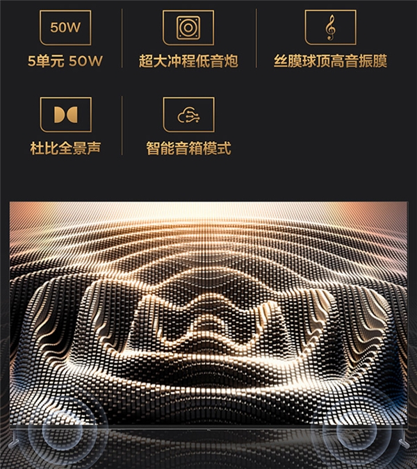 优秀的音效能让观影更加具有沉浸感。TCL 98Q6E搭载专业级家庭影院安桥音响,具备5单元50W功率,拥有超大冲程低音炮,丝膜球顶高音振膜,无论是玩游戏、看电影,看综艺,都可以营造出清晰、饱满且富有深度的音效。再搭配杜比全景声,可以给用户带来“余音绕梁”的沉浸体验。