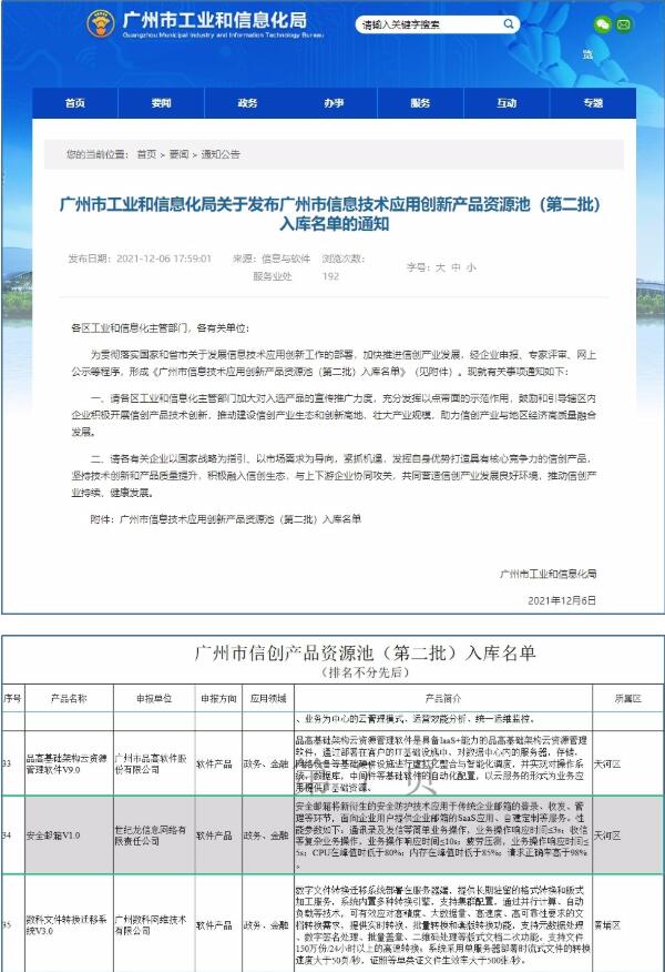 2021年12月06日,广州市工业和信息化局发布了“广州市信息技术应用创新产品资源池(第二批)入库名单通知”。中国电信安全邮箱产品成功入库,是本次名单中邮箱消息安全领域唯一入库的产品,产品实力和创新能力再获认可!