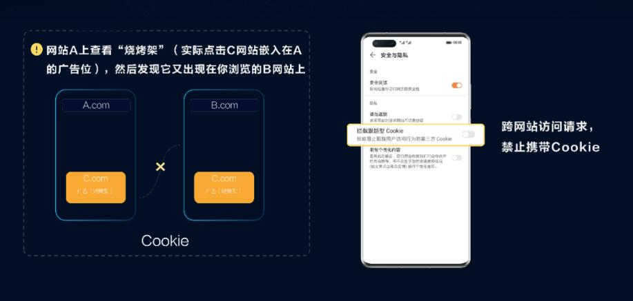 智能防跟踪——甩掉跟踪者。华为浏览器的“智能防跟踪”功能可以提前识别跟踪型网址,并同步到你的手机。当你访问这些网址时,浏览器会发送请求自动禁止携带跟踪Cookie,从而阻断这种跨网站的跟踪行为。以上操作全部在手机中完成,保护隐私的同时不会影响正常网站的使用。
