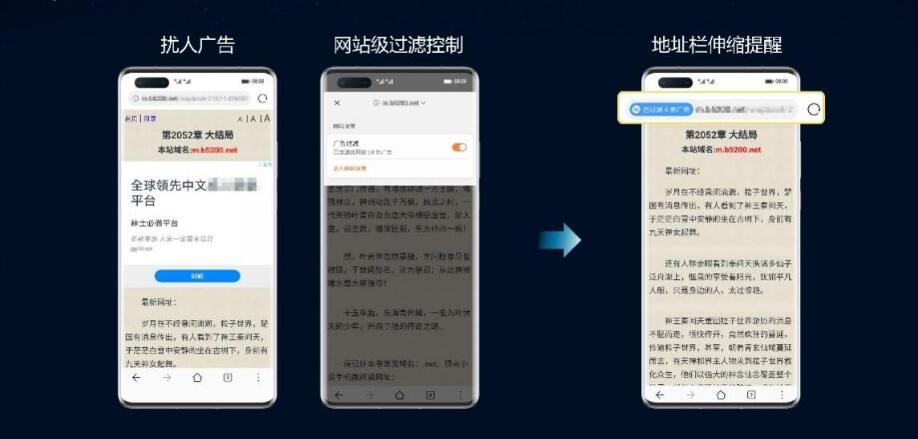 广告过滤——净化浏览环境。华为浏览器提供网站级广告过滤控制能力,并在地址伸缩栏实时提示已过滤广告的条数。当你浏览骚扰广告繁多的网站,广告过滤拦截会自动开启;对于正常网站,你也可以根据自己的喜好设置广告过滤功能。你还可以手动标识并屏蔽广告,从此广告不再骚扰你。