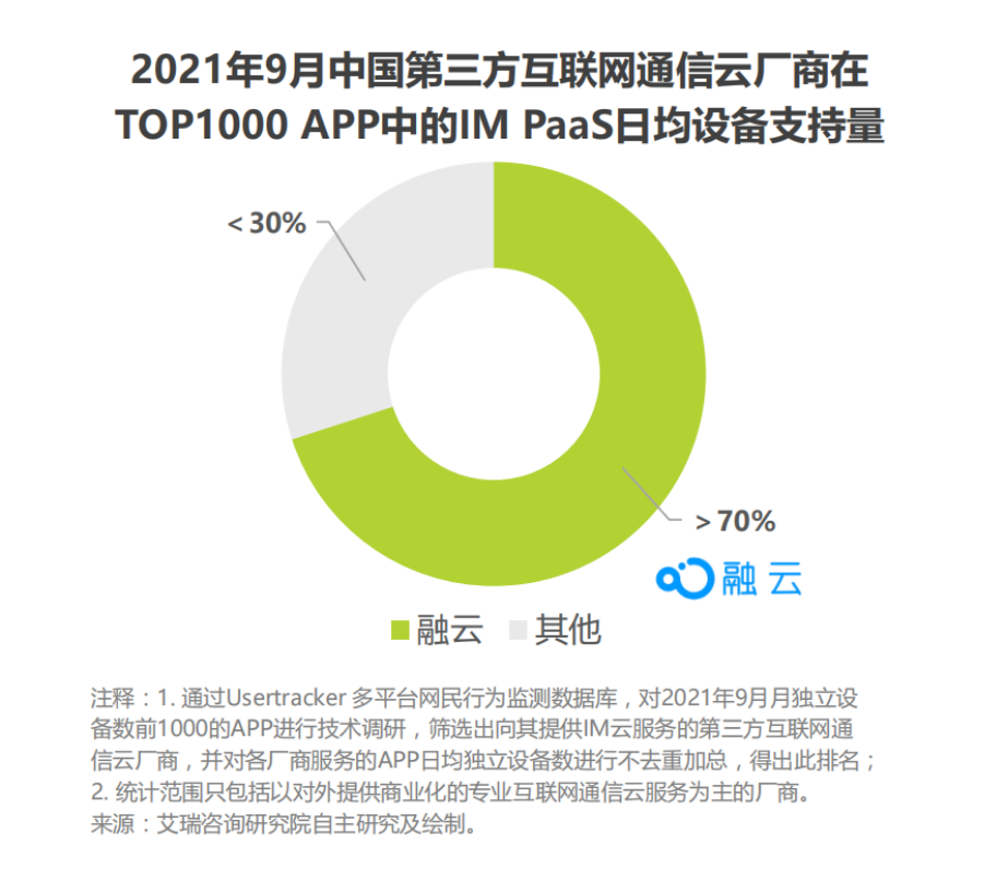 根据艾瑞咨询 Usertracker 多平台网民行为监测数据库显示,月独立设备数居 TOP1000 的头部 APP 中,融云 IM 覆盖到的 APP 日活设备数加总(非去重)超过 9000 万台,仍居国内第三方厂商的首位。