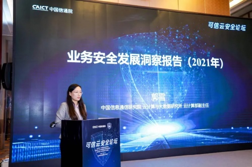 为此,中国信息通信研究院(以下简称“中国信通院”)基于业务安全产业的深入分析和全面调研,结合国内外业务安全领域发展现状,牵头编写了《业务安全发展洞察报告(2021年)》,并在2021年12月28日可信云安全论坛上由中国信通院云大所云计算部副主任郭雪进行了发布和解读。