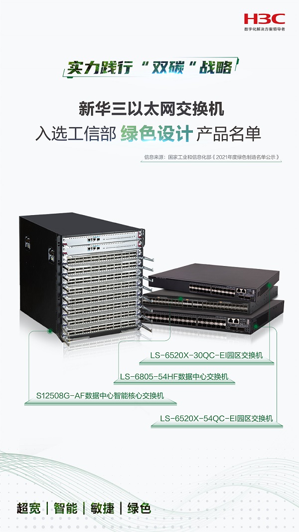 日前,工信部发布了涵盖“绿色工厂”、“绿色设计产品”、“绿色工业园区”等在内的《2021年度绿色制造名单公示》。紫光股份旗下新华三集团自研的S12508G-AF、LS-6805-54HF 、LS-6520X-54QC-EI 、LS-6520X-30QC-EI 共4款交换机成功入选工信部2021年度绿色设计产品名单——以太网交换机类别。值得一提的是,在该类别6个入选产品中新华三品牌产品占据4个席位,彰显新华三始终秉承绿色可持续发展理念,以深厚技术积累与持续创新助力国家“双碳”目标实现。