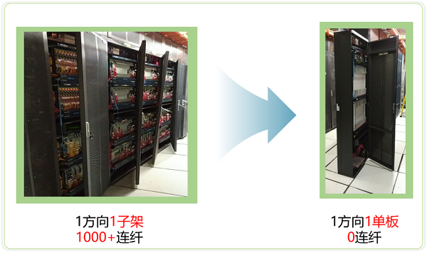 北京作为国家的政治经济中心,城市内业务流量大,带宽增长迅速,同时业务要求调度灵活,低时延,高可靠。北京联通针对现网进行业务梳理,在核心局点枢纽楼、双井、广安等创新部署OXC方案。该采用全光背板创新架构,无需板间连纤维,核心局点由原来多个设备和机柜组成的复杂系统演变为一个机柜一台设备,空间占用减少约70%,有效缓解现网核心机房空间不足问题,节省新机房建设过程中的碳排放。