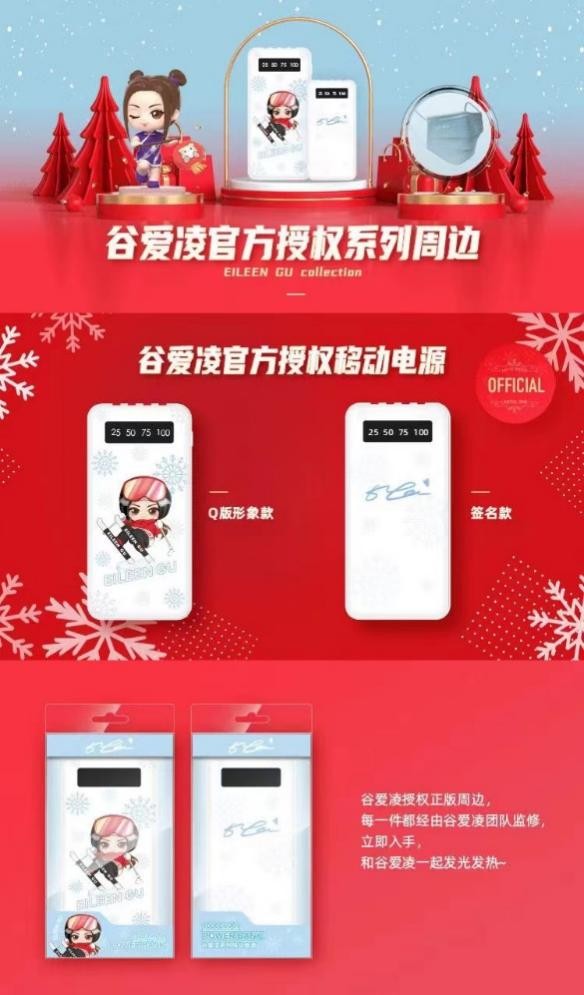 除了谷凌凌手办之外,还有谷凌凌“Meet GU移动电源”、“谷爱凌签名款口罩”等周边。此外,还有中国移动5G冰雪之队系列移动电源-任子威签名款等周边好物。