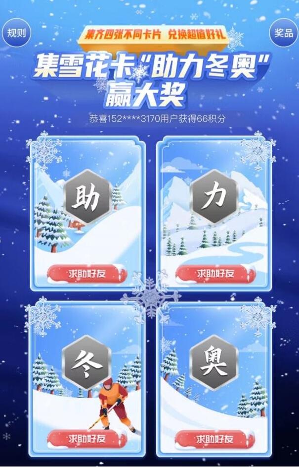 热热闹闹的元宵刚过,开工、开学如期提上日程。为了给大家送上开工惊喜,央视频“集雪花卡”活动开启福利大放送,只要集齐“助”“力”“冬”“奥”四张不同雪花卡,中奖概率将大大提升。这也掀起了一小波高潮,不少网友表示,“急求‘冬’字!”