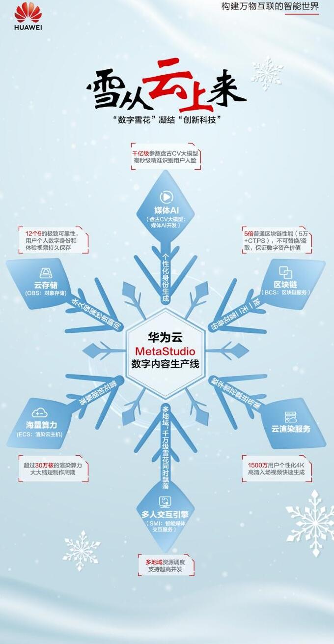 实际上,“集雪花卡”活动仅仅是央视频于2022年1月5日推出的“数字雪花”互动项目中的一个惊喜玩法。用户登录央视频APP进入“玩转雪花”专区,还能体验“定制我的数字雪花”、获得数字雪花特别证书、专属雪花飘进鸟巢视频等创新玩法。而这些创新玩法,是央视频基于华为云MetaStudio数字内容生产线,并率先使用了媒体AI、云渲染、区块链等系列前沿云计算技术打造而成,不仅科技感满满,更借助技术加持,让用户以新的方式玩转冰雪季,留住美好回忆。