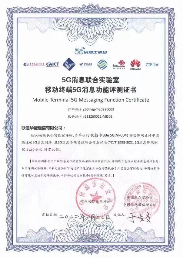 自2020年4月8日三大运营商联合发布5G消息白皮书以来,中国联通逐步推进业务落地,基于自主手机品牌“优畅享”专项研发了支持5G消息的智能终端,助力应用推广落地。目前,优畅享30e手机的两种芯片版本均已经实现了对中国联通5G消息业务的支持。这其中,联发科技芯片版本还是首批获得移动终端5G消息功能测评证书的手机产品之一,该证书由中国信息通信研究院泰尔终端实验室依据最新的行业标准《YD/T 3958-2021 5G消息终端测试方法》颁发,评测项目包括点对点消息测试和行业消息测试等。