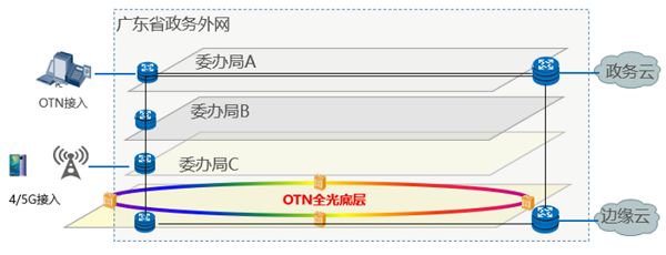 广东省政务外网基于OTN全光互联,构建覆盖全省的新型政务外网,按照管理模式,由省级、地(市)、县(区)三级网络平台组成。纵向覆盖省、地(市)、县、乡镇、村居(按需)各层级行政区域,通过省级、市级、县级城域网横向连通全省各级党委、人大、政府、政协、法院、检察院等政务部门。核心节点连接21个地市广域网核心节点,汇聚节点连接省直单位。各网元间采用OTN互联,带宽以100G互联为主;核心与地市、省城各委办局、云互联、互联网出口全部采用OTN全光网络互联,带宽以100G和10G为主。