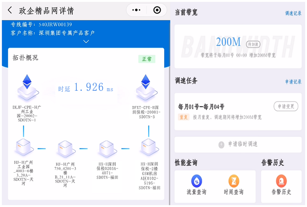 ● 自服务:广东联通全光网还提供了大客户专属APP,打造了客户自助服务能力。它采用类似电商化的程序界面,提供专线业务监控和带宽调节等服务。在APP内可以清晰的展示政企精品网全省线路的拓扑情况、专线时延、专线业务状态等信息。
