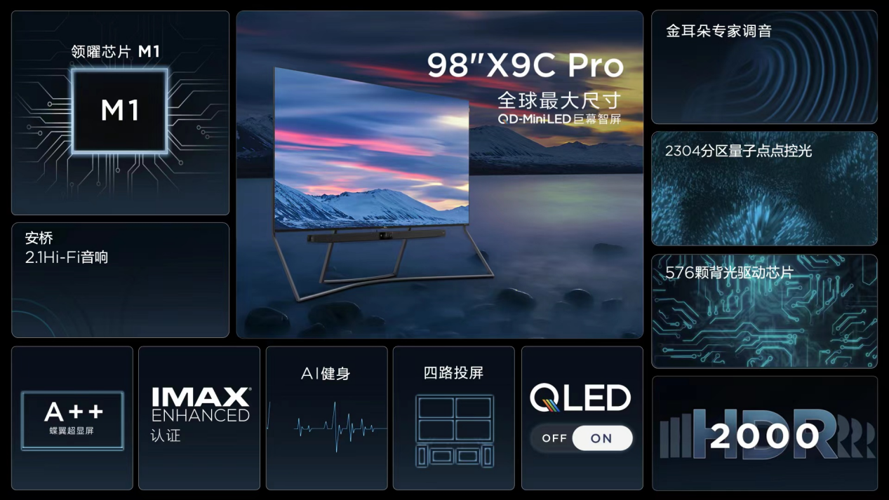 TCL 98X9C Pro无论在音质还是画质方面,都全方位碾压了同尺寸、同价位的产品,是巨幕智屏领域当之无愧的王者!不仅一次次刷新消费者的认知,将98英寸超大屏和QD-Mini LED两项顶级技术完美结合到了一起,作为超大屏领域以及QD-Mini LED的领跑者,实力自然是毋庸置疑!在以用户体验为王道的时代,TCL顺应市场需求,用技术充实内核,相信不久的将来。TCL还会给我们带来更多的惊喜!