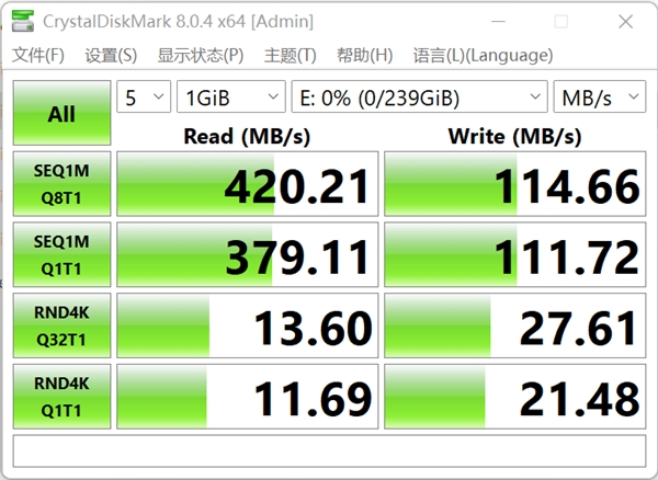 首先是Crystal Disk Mark,实测空盘状态下三星Type-C闪存盘持续读取速度能够达到420MB/s,写入速度能够达到近115MB/s。其中读取速度已经超过了官方标称的400MB/s的速度,对于一款优盘产品来说,115MB/s的写入速度同样可观,毕竟市面上大多数同类型产品的写入速度还维持在50-60MB/s的水平。