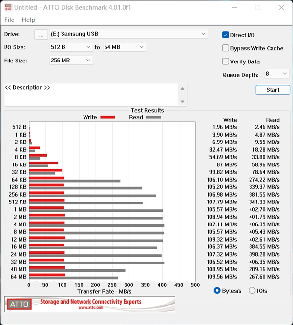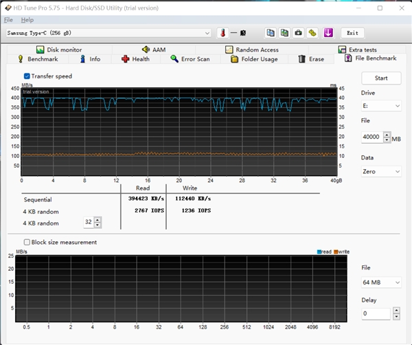 ATTO Disk Benchmark的柱状图能够反映出优盘的稳定性。从软件测试来看,三星Type-C闪存盘在测试文件为1MB时Type-C闪存盘的读取速度已经可以达到402MB/s左右,之后可以保持在400MB/s左右的峰值读取速度。读取速度在文件大小为48MB/s之后有所降低,但依然可以保持在260MB/s以上。另据HD Tune Pro软件文件基准40GB文件读写测试结果,三星Type-C闪存盘的读取速度会出现阶段性增减,但总体都能维持在峰值运行。