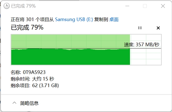 官方表示使用三星Type-C闪存盘传输4GB大小的文件仅需11s左右,实测无论是4GB的视频文件还是4GB RAW格式照片都能达到这一标准,甚至还会更快;