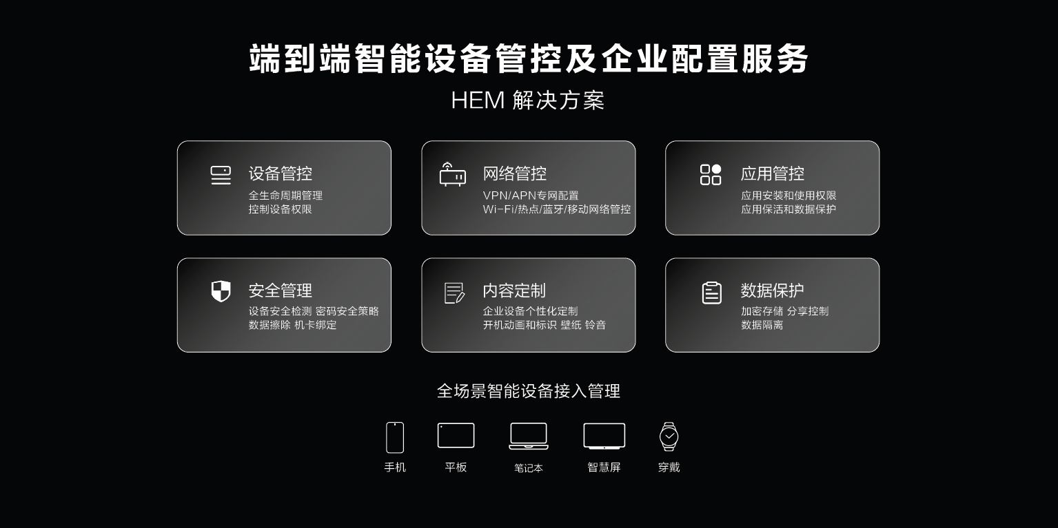 HEM解决方案从硬件端口、应用软件、数据内容、网络接入、安全认证、运行模式等多个维度进行加固、管理和控制,帮助企业实现移动信息化设备管理与个性化终端配置。