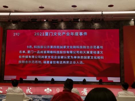 2022年4月25日下午,第九届(2021)厦门文化产业年度风云榜颁奖典礼在集美湖畔举行,文化产业精英汇聚一堂,共同见证光荣时刻、分享宝贵经验。中国电信新国脉旗下天翼爱动漫文化传媒有限公司(以下简称爱动漫)在此次颁奖典礼中荣获第九届(2021)厦门文化产业年度风云榜“年度企业”称号。